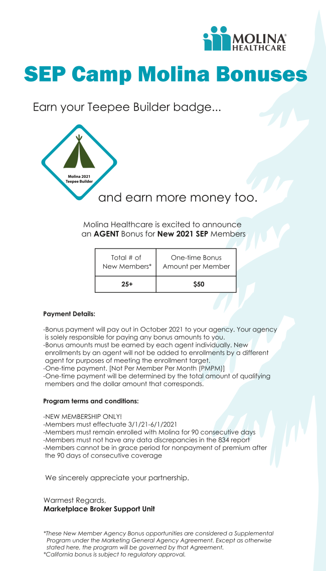 Molina Healthcare is excited to announce an Agent Bonus for New 2021 SEP Members.